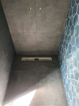 In Appingedam hebben wij deze mooie en nette badkamer mogen betegelen. Hiervoor is gebruikgemaakt van hexagonvormige tegels in verschillende blauwe tinten. Voor een ander deel van de wand en de vloer is gekozen voor grote rechthoekige tegels in een licht antraciete kleur.